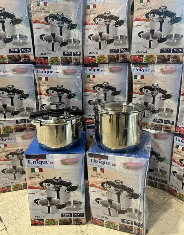 زودپز دوقلو یونیک پرو ۵و۷ لیتری استیل ۱۸/۱۰ درب کلیپسی ودرب پیرکس سوپاپ اطمینان دوتا دیگ یدونه ۵ ویدونه ۷ لیتری کف حک شده